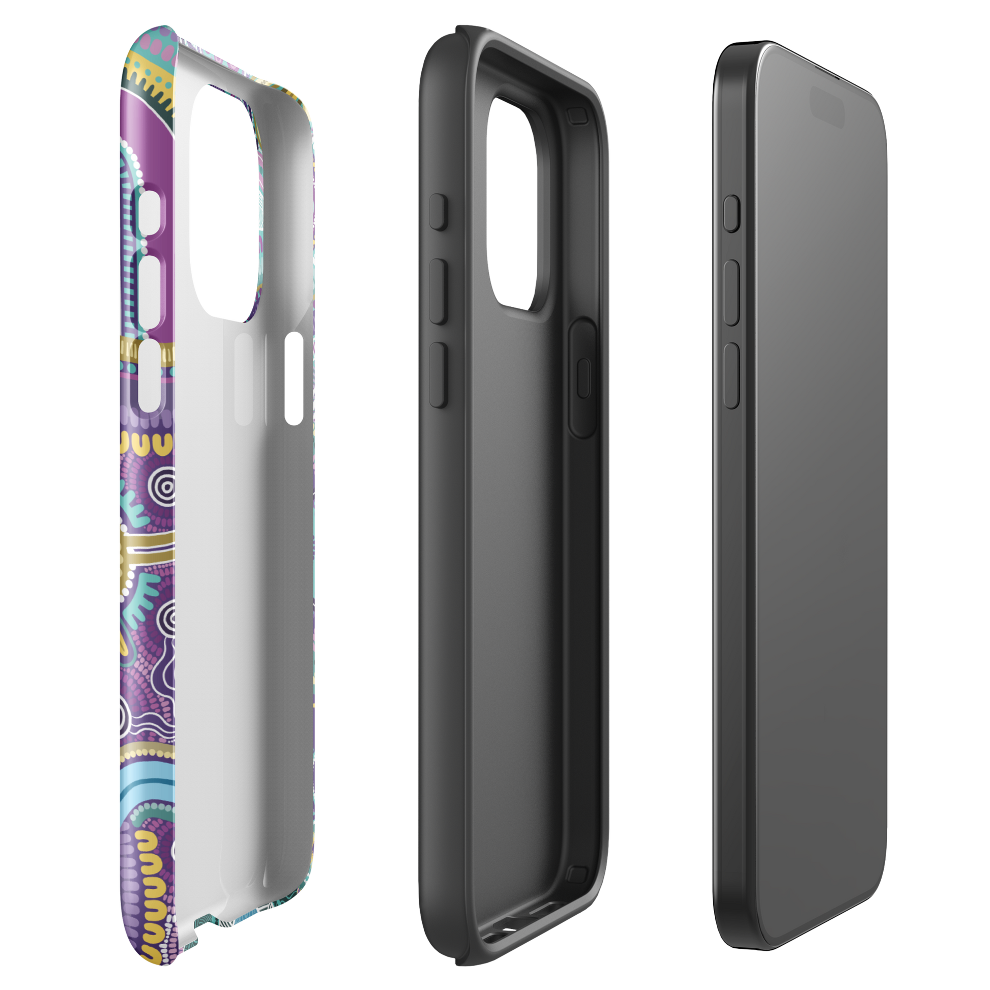 Protect your phone with cultural flair and style using a durable, dual-layered iPhone case featuring the 'Guwaabal' Aboriginal artwork by Amy Allerton. The outer shell is made of impact-resistant polycarbonate, while the inner lining sports TPU lining for maximum impact absorption. Carry culture everywhere you go while keeping your phone safe all year round!